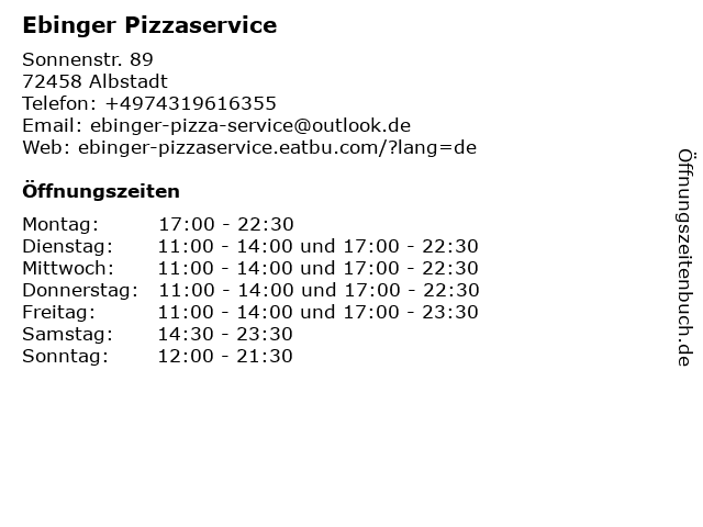 | Öffnungszeiten Ebinger Pizzaservice in Albstadt anzeigen | |