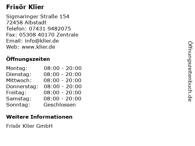 | Öffnungszeiten Frisör Klier in Albstadt anzeigen | |