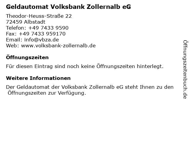 Geldautomat Volksbank Zollernalb eG in Albstadt: Telefonnummer, Öffnungszeiten und Adresse