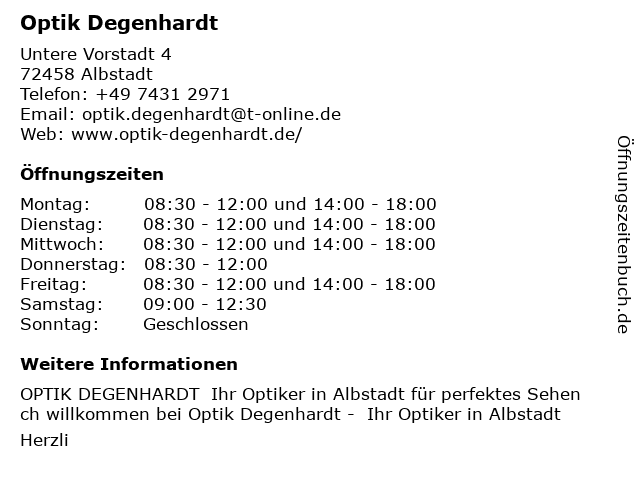 | Öffnungszeiten Optik Degenhardt in Albstadt anzeigen | |