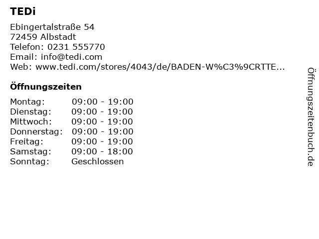 | Öffnungszeiten TEDi in Albstadt anzeigen | |