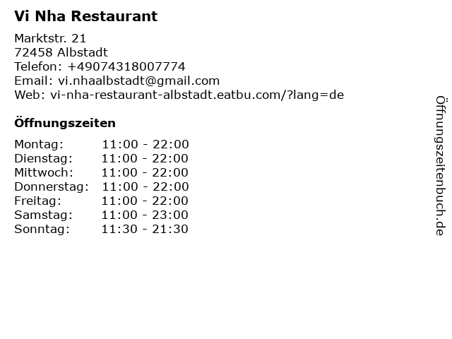 | Öffnungszeiten Vi Nha Restaurant in Albstadt anzeigen | |