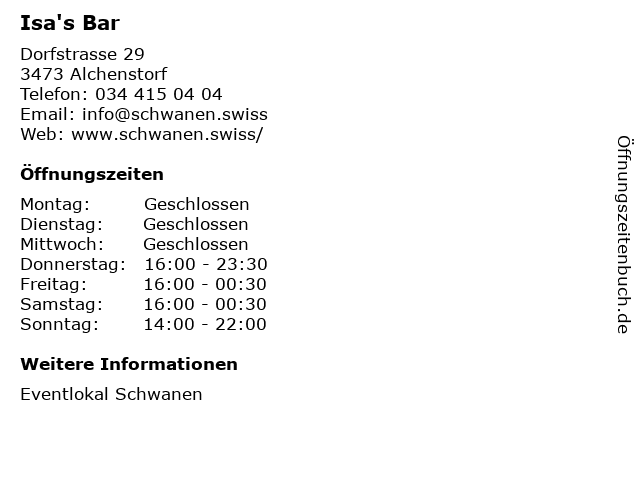 | Öffnungszeiten Isa's Bar in Alchenstorf anzeigen | |