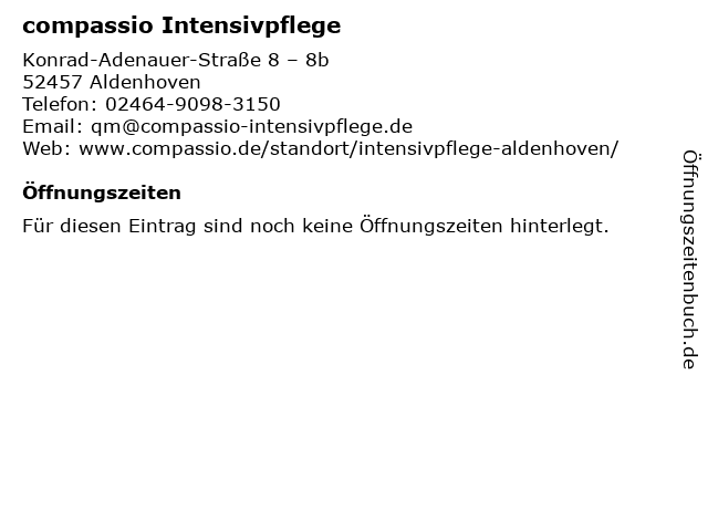 | Öffnungszeiten compassio Intensivpflege in Aldenhoven anzeigen | |