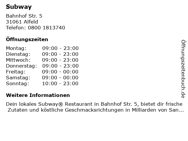 | Öffnungszeiten Subway in Alfeld anzeigen | |