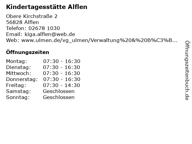 | Öffnungszeiten Kindertagesstätte Alflen in Alflen anzeigen | |