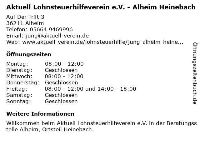 Branchen & Suchbegriffe zu Aktuell Lohnsteuerhilfeverein e.V. - Alheim Heinebach:aktuell, alheim, e.v., heinebach, lohnsteuerhilfeverein |