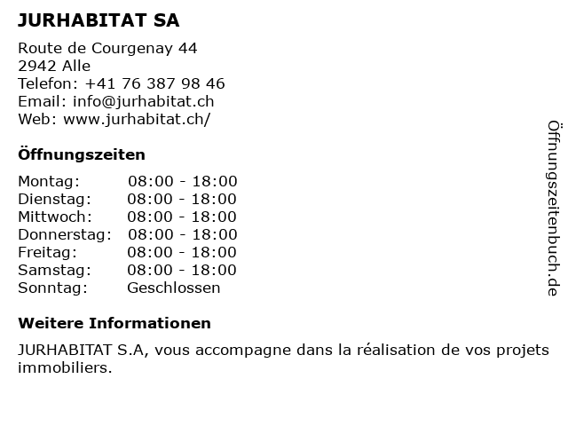 | Öffnungszeiten JURHABITAT SA in Alle anzeigen | |