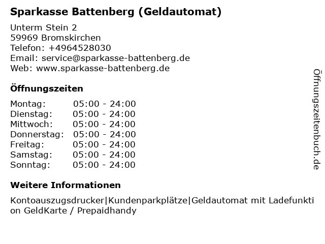 1 Sparkasse Marburg-Biedenkopf (Geldautomat) (Entfernung: 8,10 km) Berliner Straße 18, 35088 Battenberg 6 Sparkasse Mitten im Sauerland (BeratungsCenter) (Entfernung: 1,60 km) Petrusstraße 3, 59969 Hallenberg |