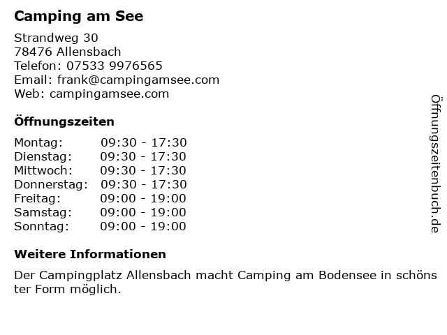 | Öffnungszeiten Camping am See in Allensbach anzeigen | |