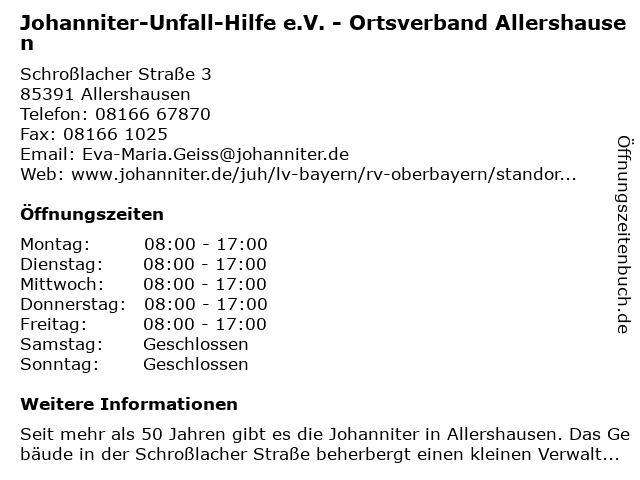 Branchen & Suchbegriffe zu Johanniter-Unfall-Hilfe e.V. - Ortsverband Allershausen:allershausen, e.v., gemeinnützige organisation, hilfe, hilfsorganisation, johanniter, ortsverband, sozialarbeit, unfall, verband, wohlfahrtseinrichtung |