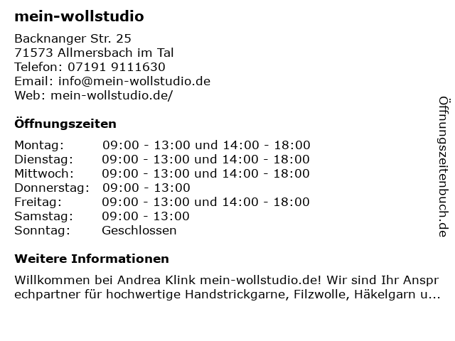 | Öffnungszeiten mein-wollstudio in Allmersbach im Tal anzeigen | |