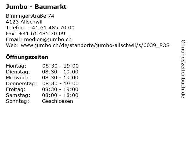 | Öffnungszeiten Jumbo - Baumarkt in Allschwil anzeigen | |