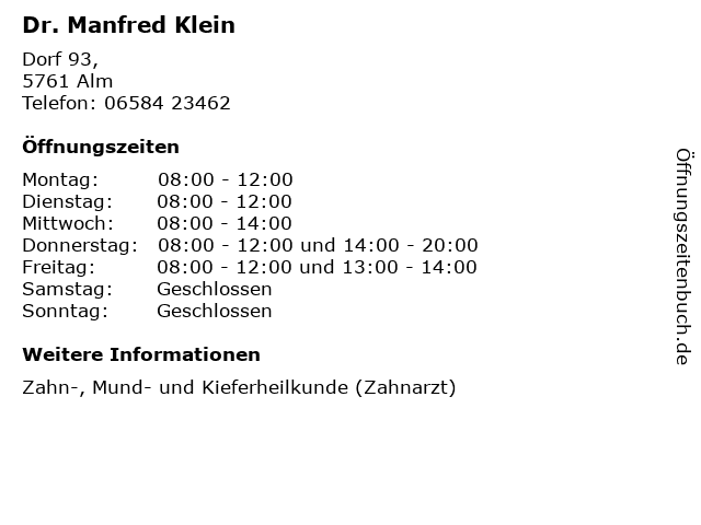 | Öffnungszeiten Dr. Manfred Klein in Alm anzeigen | |