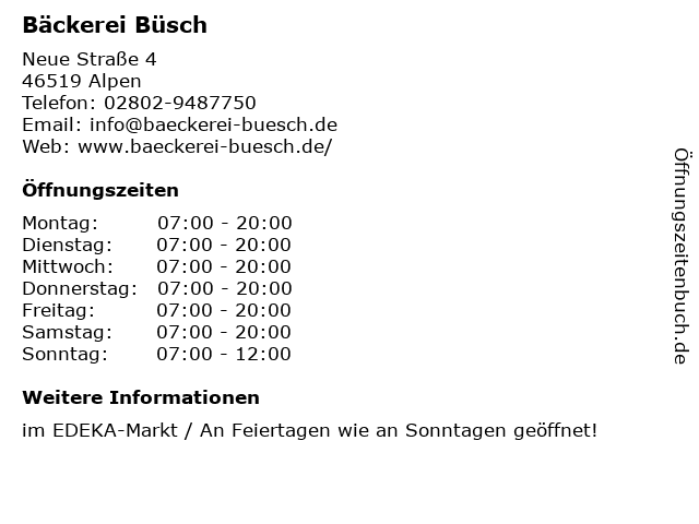 | Öffnungszeiten Bäckerei Büsch in Alpen anzeigen | |