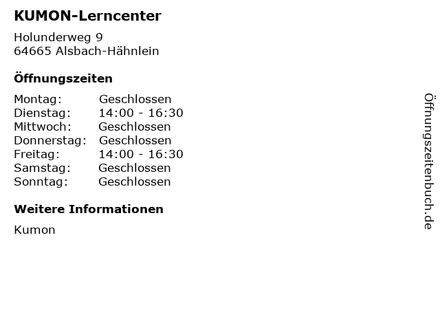 | Öffnungszeiten KUMON-Lerncenter in Alsbach-Hähnlein anzeigen | |