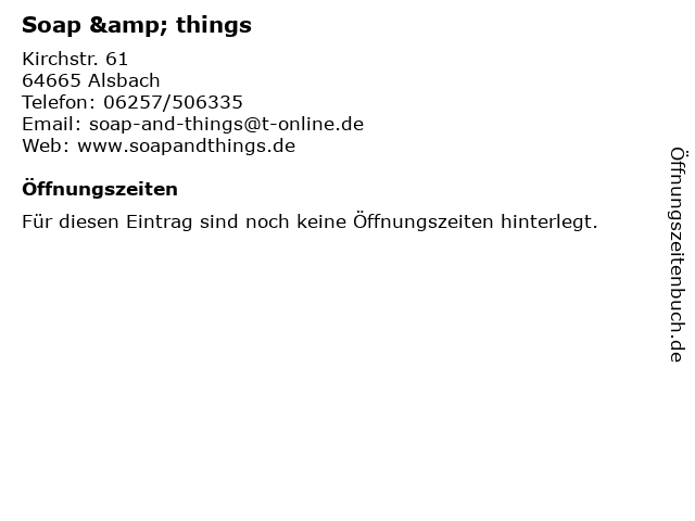 | Öffnungszeiten Soap & things in Alsbach anzeigen | |
