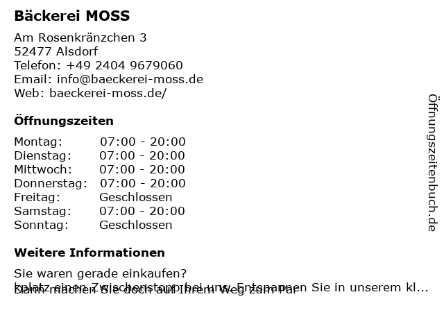 | Öffnungszeiten Bäckerei MOSS in Alsdorf anzeigen | |