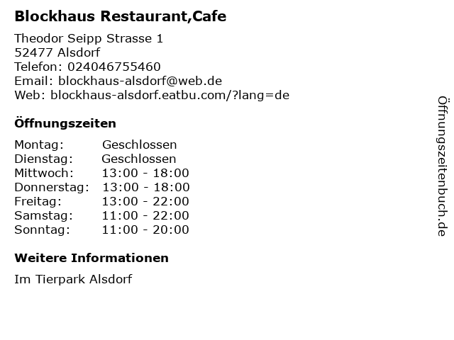 | Öffnungszeiten Blockhaus Restaurant,Cafe in Alsdorf anzeigen | |