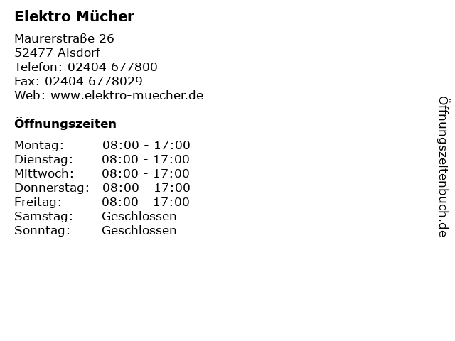| Öffnungszeiten Elektro Mücher in Alsdorf anzeigen | |