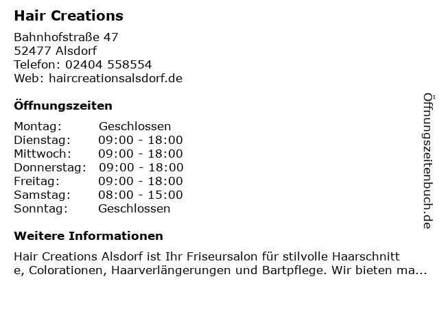 | Öffnungszeiten Hair Creations in Alsdorf anzeigen | |