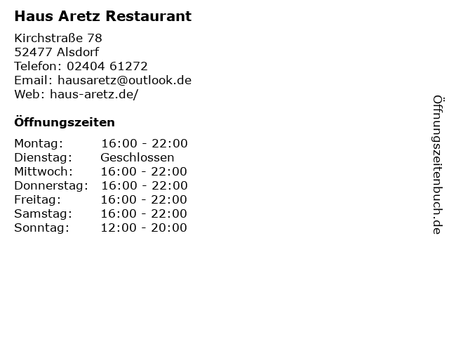 | Öffnungszeiten Haus Aretz Restaurant in Alsdorf anzeigen | |