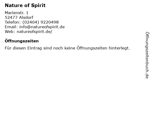 | Öffnungszeiten Nature of Spirit in Alsdorf anzeigen | |