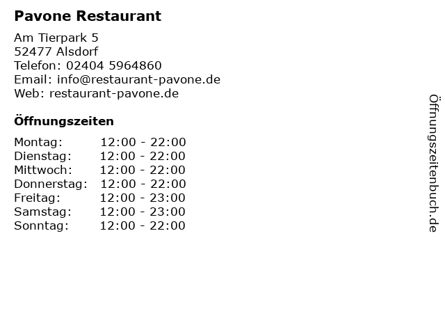 | Öffnungszeiten Pavone Restaurant in Alsdorf anzeigen | |