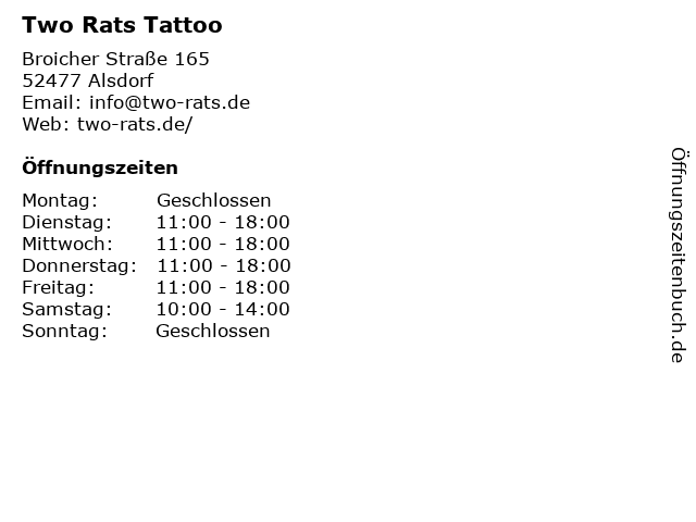 | Öffnungszeiten Two Rats Tattoo in Alsdorf anzeigen | |