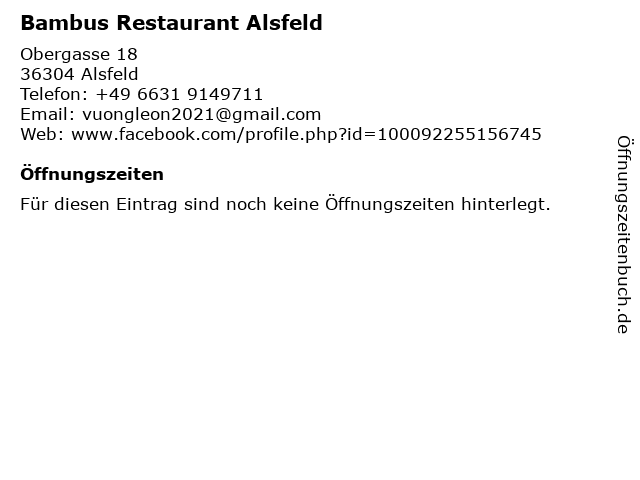 | Öffnungszeiten Bambus Restaurant Alsfeld in Alsfeld anzeigen | |