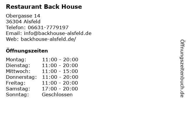 | Öffnungszeiten Restaurant Back House in Alsfeld anzeigen | |