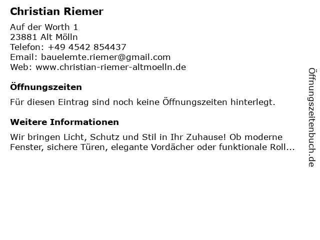 | Öffnungszeiten Christian Riemer in Alt Mölln anzeigen | |