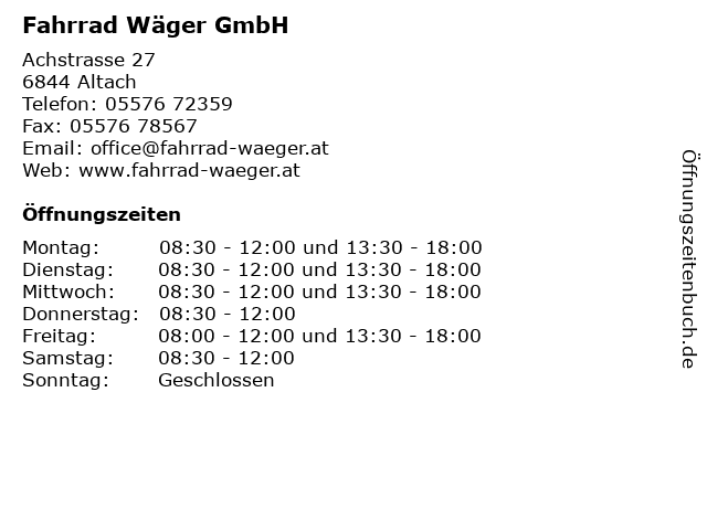 | Öffnungszeiten Fahrrad Wäger GmbH in Altach anzeigen | |