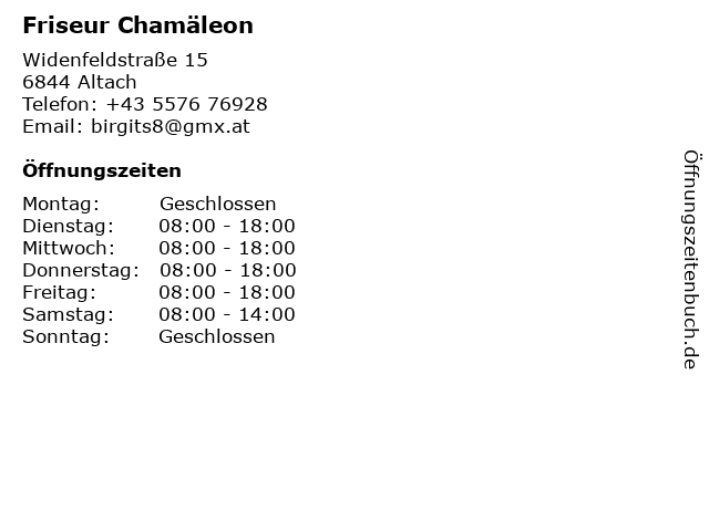 | Öffnungszeiten Friseur Chamäleon in Altach anzeigen | |
