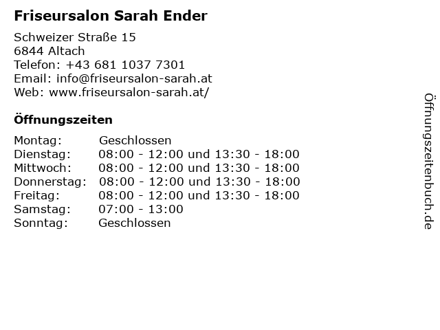 | Öffnungszeiten Friseursalon Sarah Ender in Altach anzeigen | |