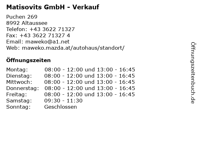 | Öffnungszeiten Matisovits GmbH - Verkauf in Altaussee anzeigen | |