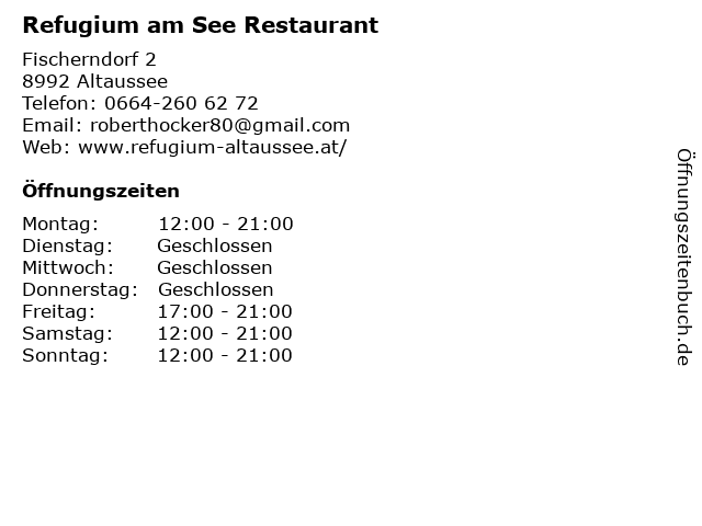 | Öffnungszeiten Refugium am See Restaurant in Altaussee anzeigen | |