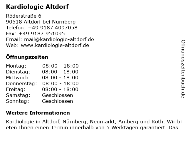 1 Dr. Gauß, Prof. Dr. Jeserich, Dr. Haggenmiller, Gemeinschaftspraxis Kardiologie (Entfernung: 0,49 km) Neumarkter straße 6, 90518 Altdorf bei Nürnberg 2 Gregor Haack Facharzt für Innere Medizin und Kardiologie (Entfernung: 14,45 km) Rudolf-Wetzer-Str. 6, 91217 Hersbruck 5 Cardiopulmonale Schwerpunktpraxis Dr. Schrader, Dr. Niederkorn-Schrader, Dr. Rapf (Entfernung: 21,18 km) Kornmarkt 2, 90402 Nürnberg 6 |