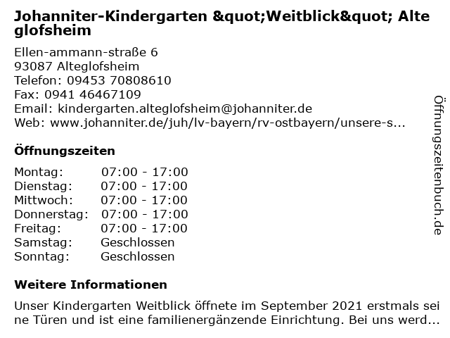 Branchen & Suchbegriffe zu Johanniter-Kindergarten "Weitblick" Alteglofsheim:"weitblick", agentur für kinderbetreuung, alteglofsheim, gemeinnützige organisation, hilfsorganisation, johanniter, kindergarten, sozialarbeit, verband, wohlfahrtseinrichtung |