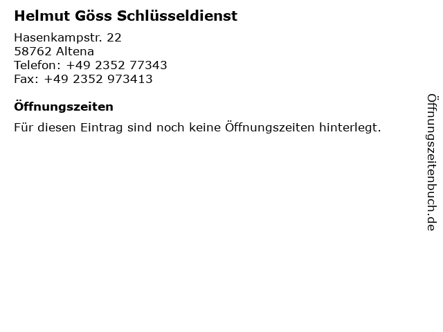 | Öffnungszeiten Helmut Göss Schlüsseldienst in Altena anzeigen | |