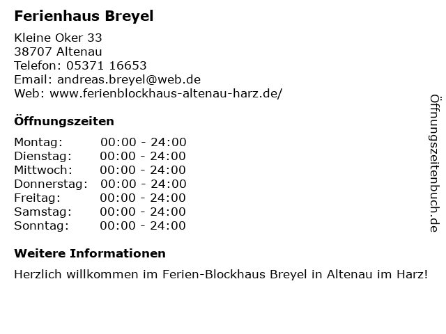 | Öffnungszeiten Ferienhaus Breyel in Altenau anzeigen | |
