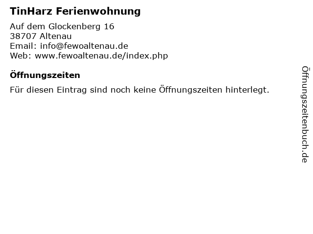 | Öffnungszeiten TinHarz Ferienwohnung in Altenau anzeigen | |