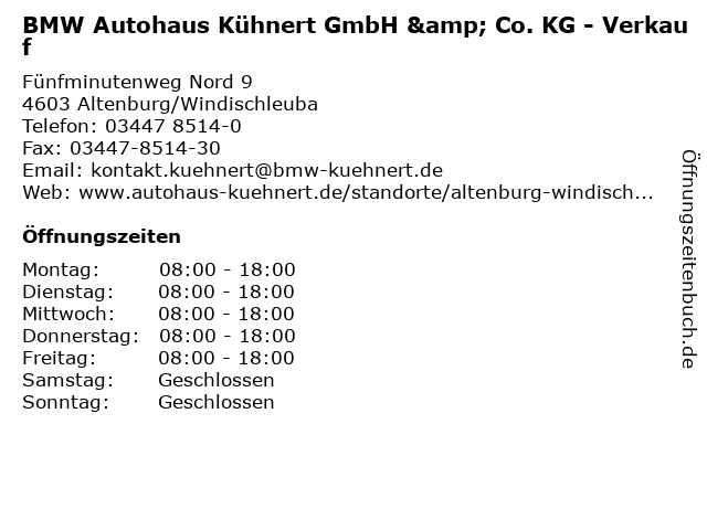 1 BMW Autohaus Kühnert GmbH & Co. KG - Service und Teile (Entfernung: 0,00 km) Fünfminutenweg Nord 9, 04603 Altenburg 6 |