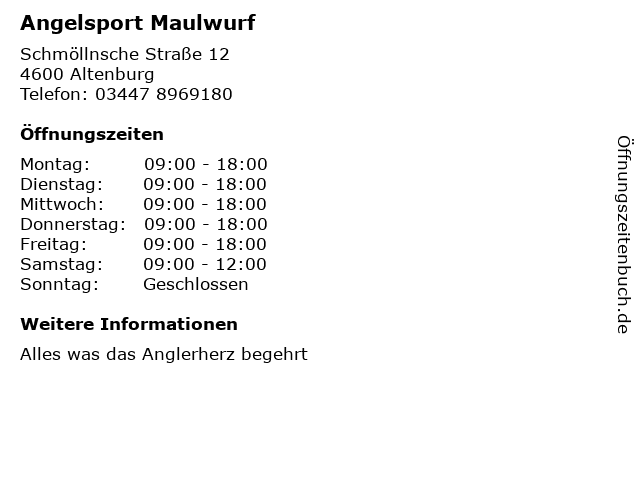 | Öffnungszeiten Angelsport Maulwurf in Altenburg anzeigen | |
