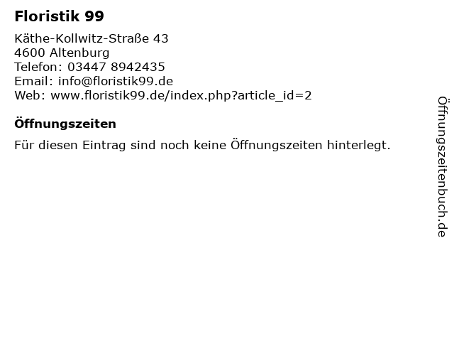 | Öffnungszeiten Floristik 99 in Altenburg anzeigen | |