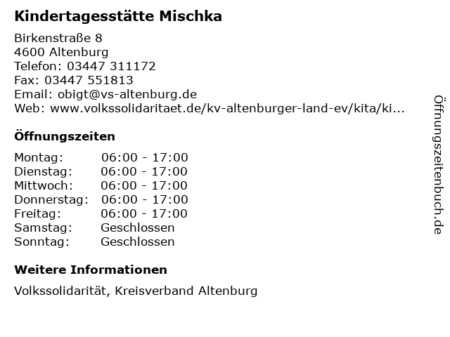 | Öffnungszeiten Kindertagesstätte Mischka in Altenburg anzeigen | |
