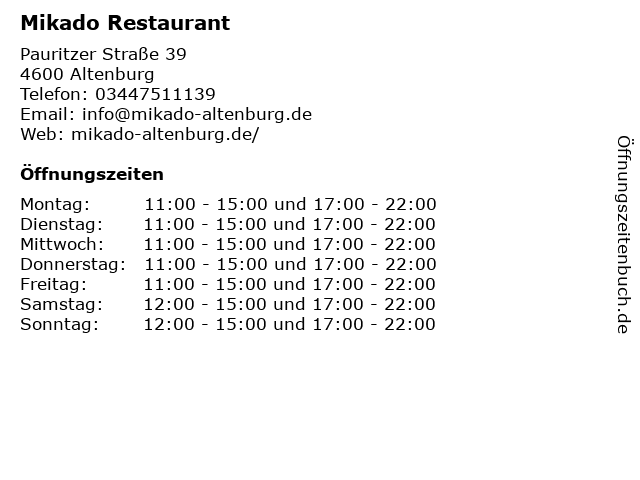 | Öffnungszeiten Mikado Restaurant in Altenburg anzeigen | |