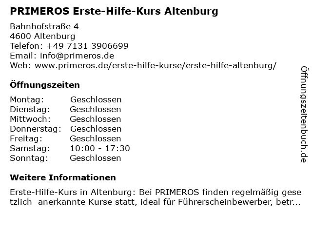 Branchen & Suchbegriffe zu PRIMEROS Erste-Hilfe-Kurs Altenburg:erste, erste hilfe am unfallort, erste hilfe kurs, erste-hilfe, erste-hilfe-kurs, führerschein sehtest, herz-lungen-wiederbelebung, herzinfarkt, hilfe, kurs, primeros, schlaganfall, stabile seitenlage, verbandmaterial, weiterbildung |