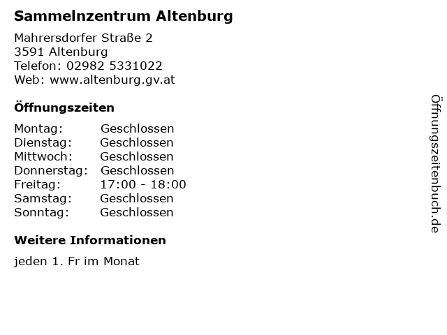 | Öffnungszeiten Sammelnzentrum Altenburg in Altenburg anzeigen | |