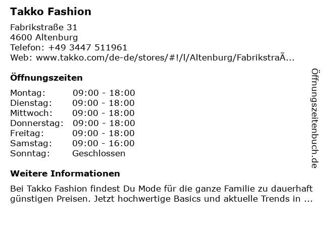 | Öffnungszeiten Takko Fashion in Altenburg anzeigen | |